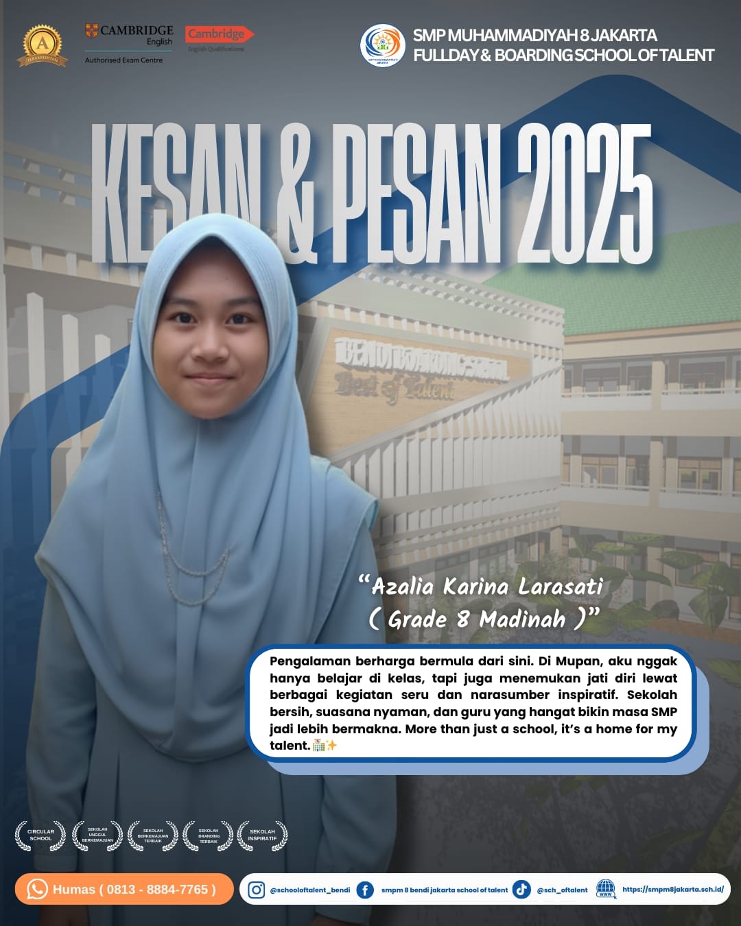 “Home for my talent,” “Rumah kedua,” “Teman dan guru yang seru.” Itulah vibes belajar di SMP Muhammadiyah 8 Jakarta! 🚀
